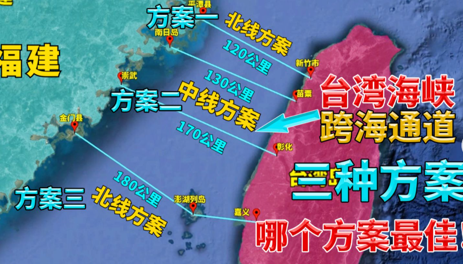 Finally, the most politically sensitive project: a cross-strait link between Fujian and Taiwan. Three routes have been proposed—north, central, and south. The northern route, from Pingtan (Fujian) to Hsinchu (Taiwan), is the shortest at 130 km, with seabed depths of 60–80 meters.