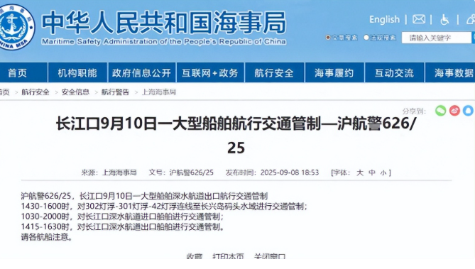 - Shanghai Maritime Safety Administration navigation notices, Sept 8–10, 2025
