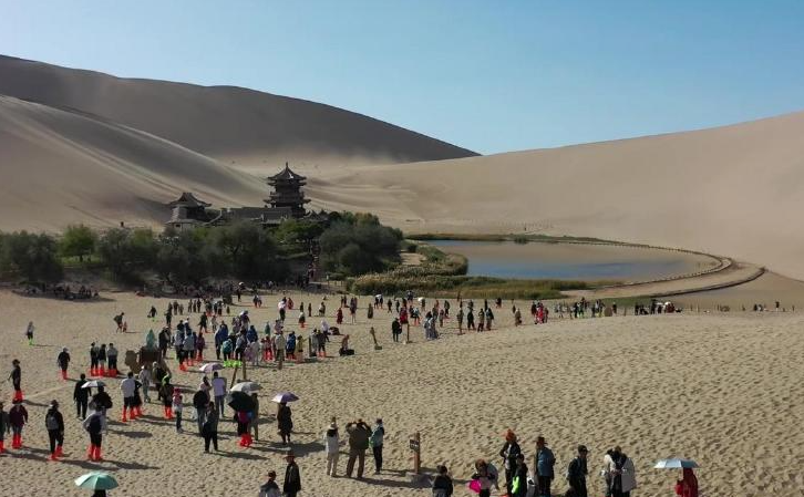 “I came for ‘straight smoke in the vast desert,’ but got ‘waves of humanity rolling in!'” quipped Xiaoli, a visitor from Zhejiang, snapping a phone pic amid Mingsha Mountain‘s dunes. His frame? A riot of colorful outfits blanketing the golden sands like a misplaced festival, erasing any whisper of isolation at the iconic Crescent Moon Spring site.