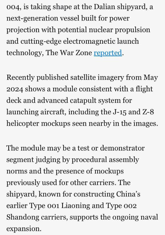 • Satellite imagery from 2024 revealed large carrier modules, consistent with nuclear propulsion and advanced catapult systems.
