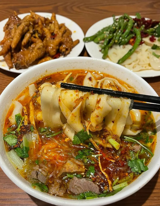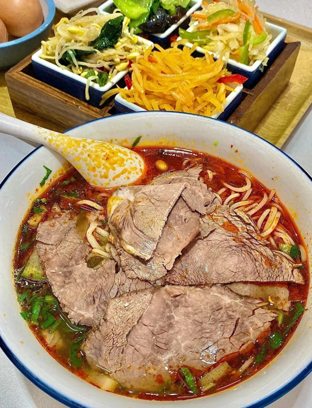 If you’re dipping into Chinese noodle culture, start here—Lanzhou beef noodles are a hallmark, famed for their “one clear, two white, three red, four green, five yellow” harmony. The broth, simmered from beef bones and meat, gleams crystal-clear with deep umami. Hand-pulled noodles hit that perfect chewy balance, paired with white radish slices, red chili oil, green cilantro and garlic chives, and yellow egg noodles. Customize thickness on the spot for a tailored bite.