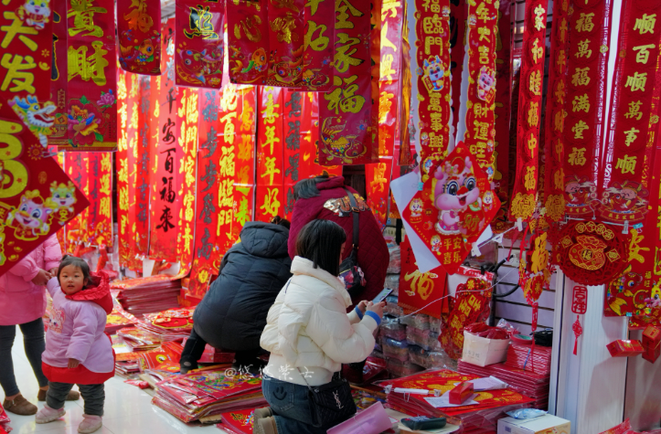 Customs: Families clean and decorate their homes, put up spring couplets and paper cuttings, set off firecrackers, wear new clothes, visit relatives, hand out red envelopes, and share a large reunion dinner featuring dumplings, rice cakes, or sweet glutinous rice balls.