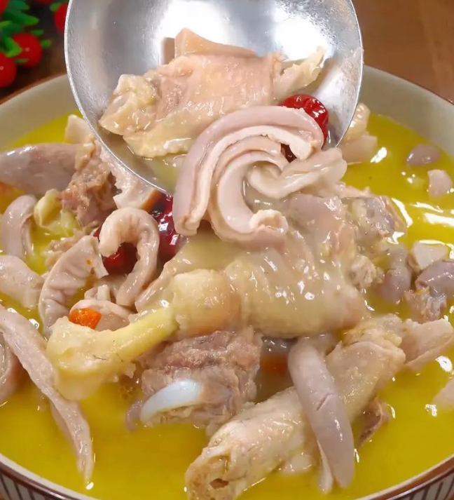 Steps: Prep and blanch stomach and chicken chunks to remove impurities. Simmer in 10 cups fresh water with ginger and scallion for 2 hours until golden and aromatic. Season—its rich broth delivers double the anti-aging nutrients.